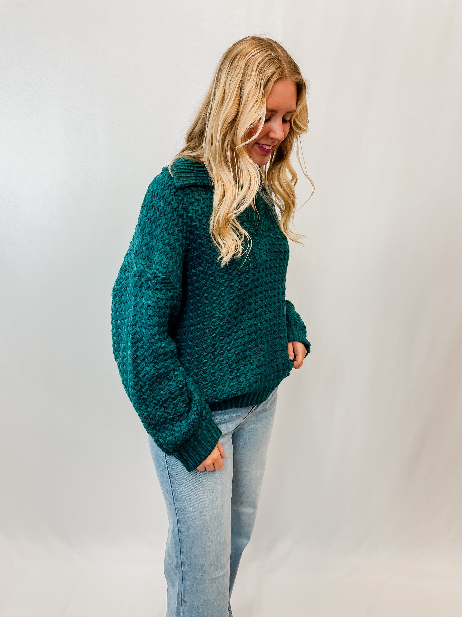 Model is wearing a size small. (We recommend sizing down! This sweater runs big.)