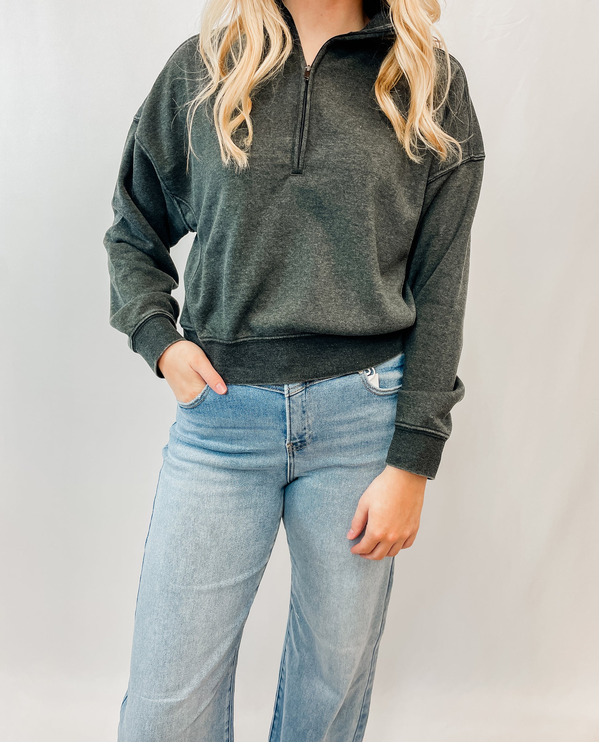 Features: half zip closure, drop shoulders, relaxed fit, cinched cuffs and hem