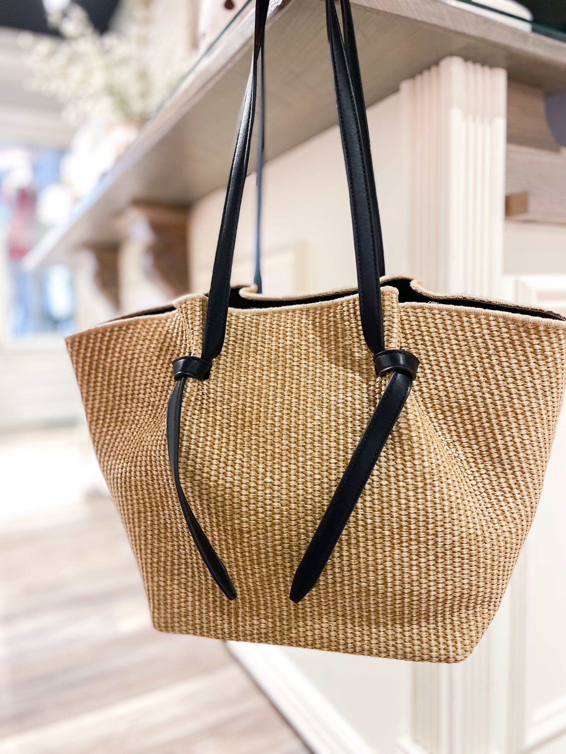 Exterior Details: woven straw body with a structured flat base and long black shoulder straps that slip over the shoulder, trim and knot detailing for balanced support