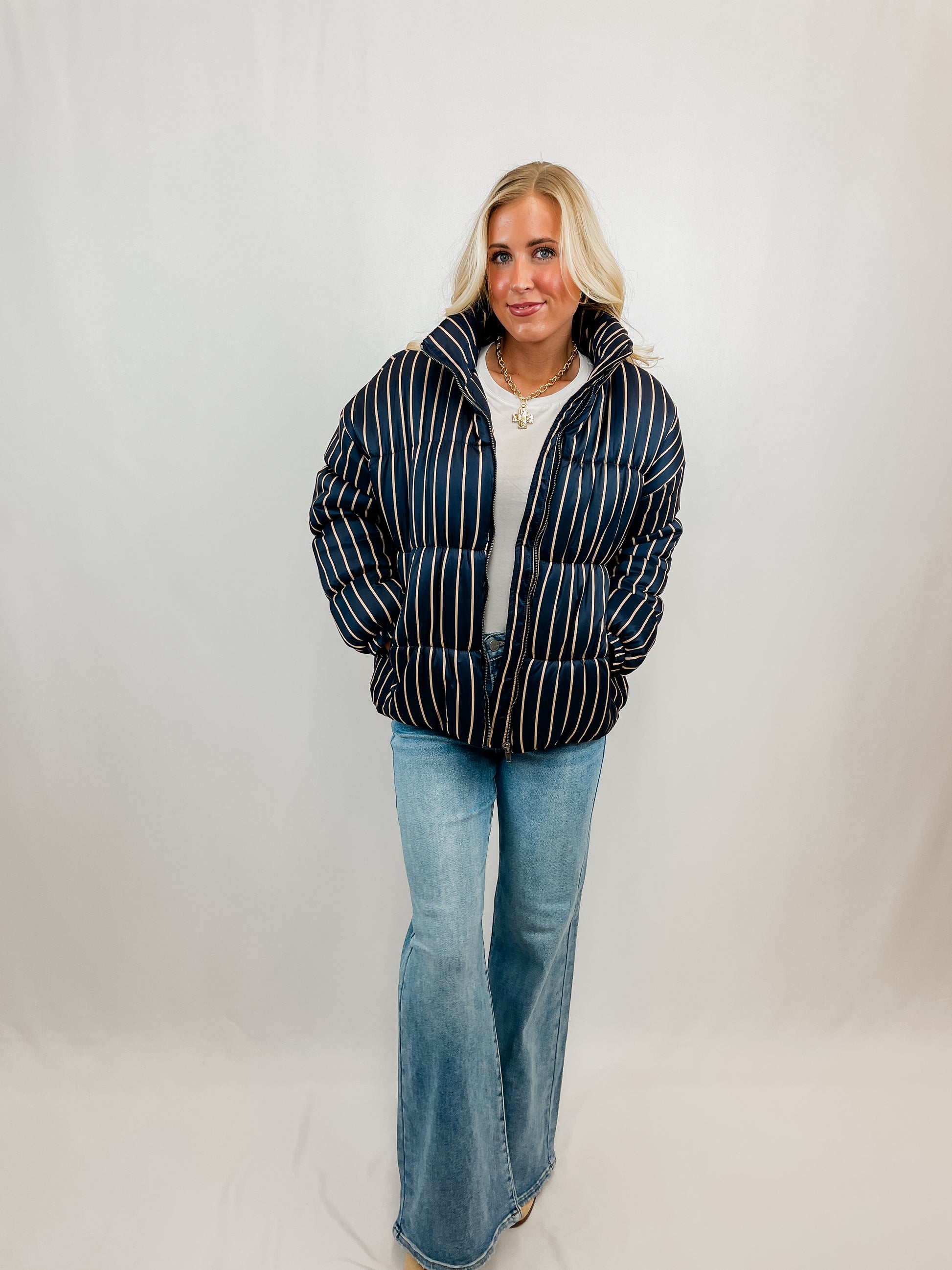 Features: high neck, vertical stripes, padded, elastic hand openings, side pockets, front zip up, lined