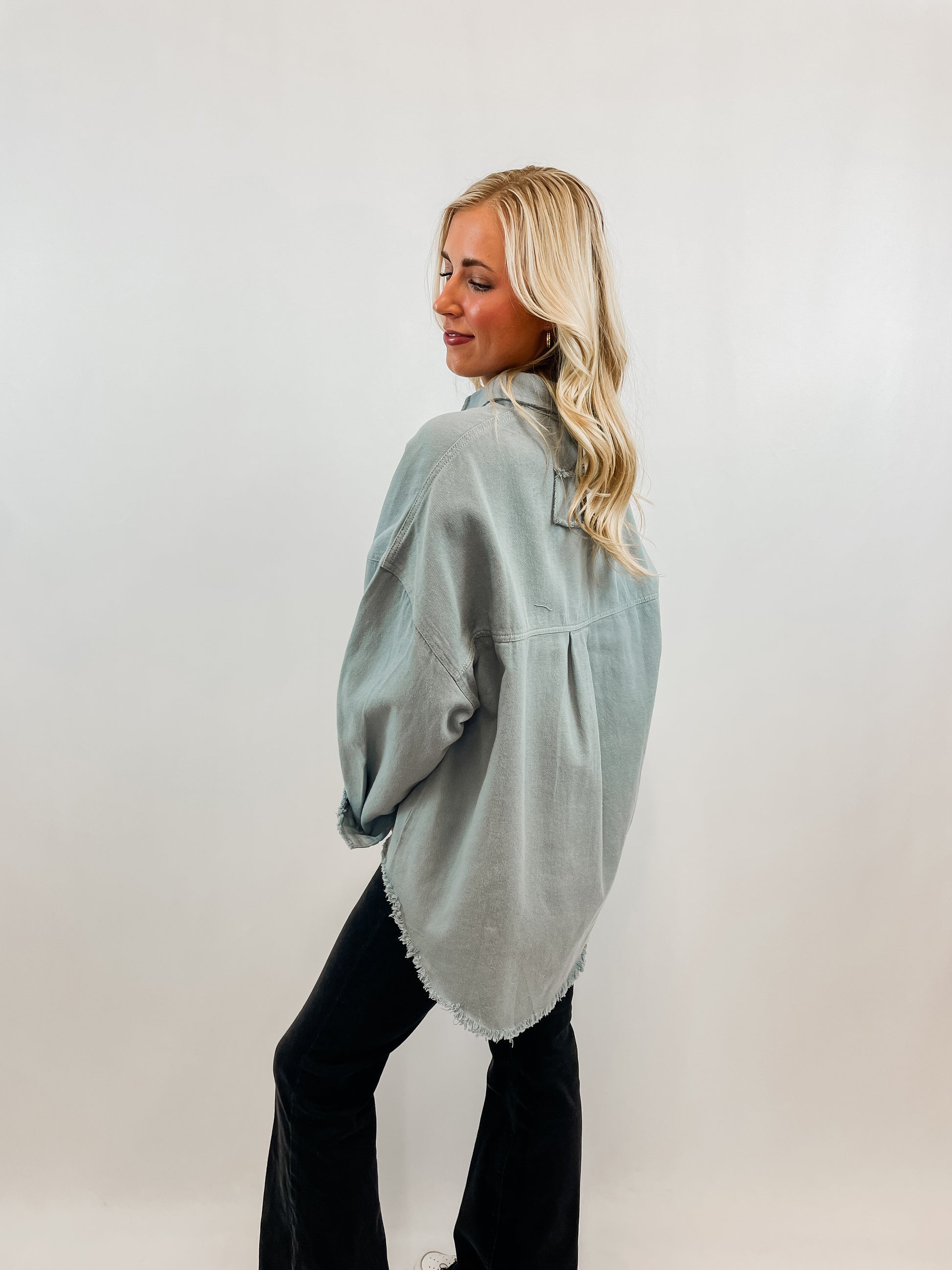 Features: washed solid twill, oversized jacket fit (recommend sizing down if wanting a true size fit), collared neck, button down closure, long sleeve with frayed hem cuff, low high hem with distressed detail
