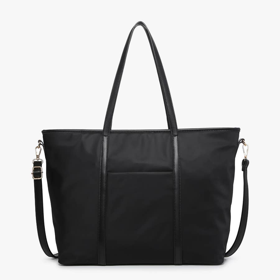 The Sadie Nylon Tote in Black combines practicality with style, featuring a spacious interior with a large snap-closure pocket and convenient slip pockets to keep essentials organized. Its back zip pocket adds extra security, while the adjustable, detachable crossbody strap offers versatile carrying options. Crafted from durable nylon with vegan leather accents and gold-tone hardware, this tote measures 19.5" long, 13" high, and 6" deep, making it perfect for everyday use without compromising elegance. Elevate your accessory game with this timeless, functional tote.